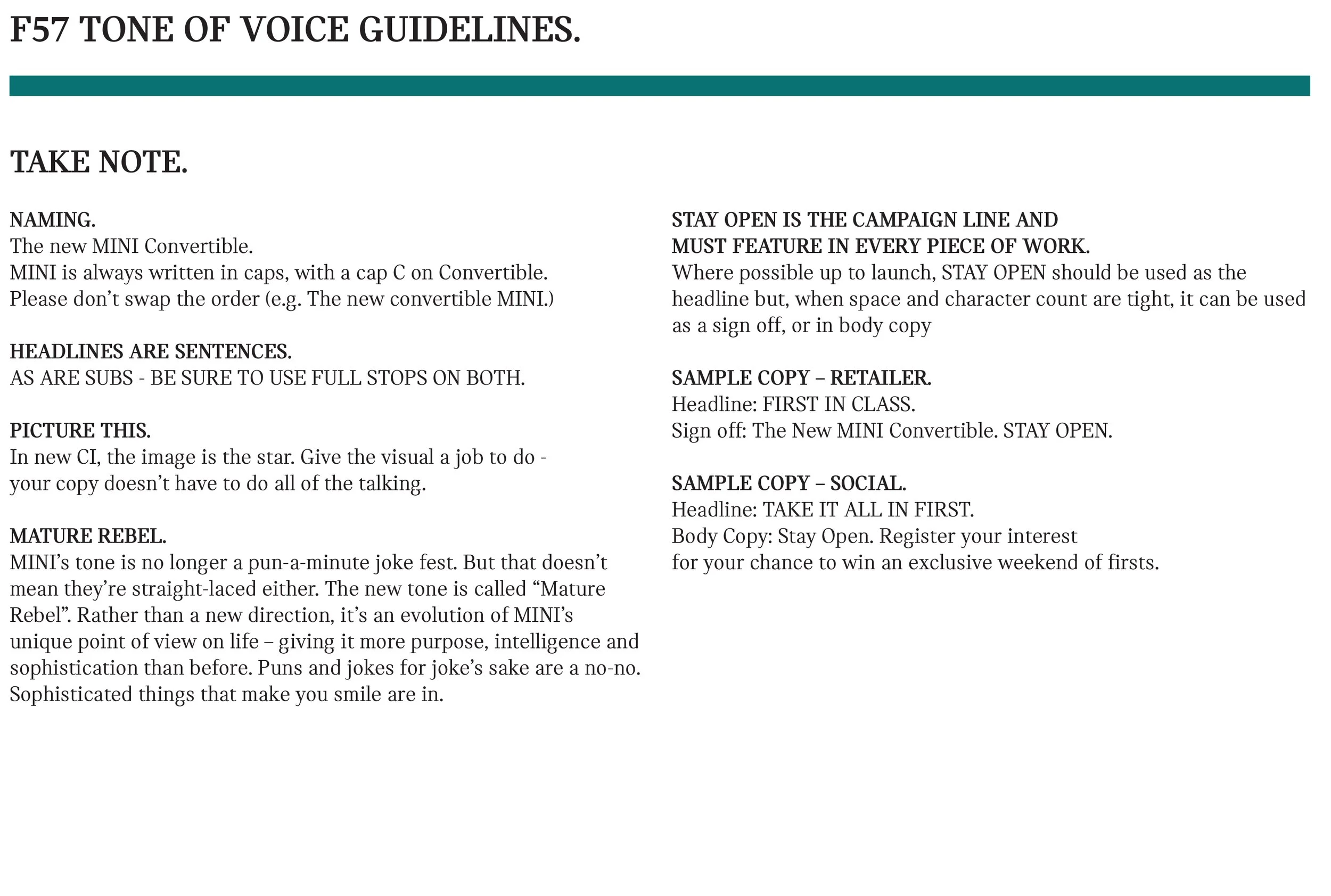 I wrote mini guidelines for this Mini car to help all creatives on the project – from the copywriters creating OOH press ads to the social team writing CTAs.